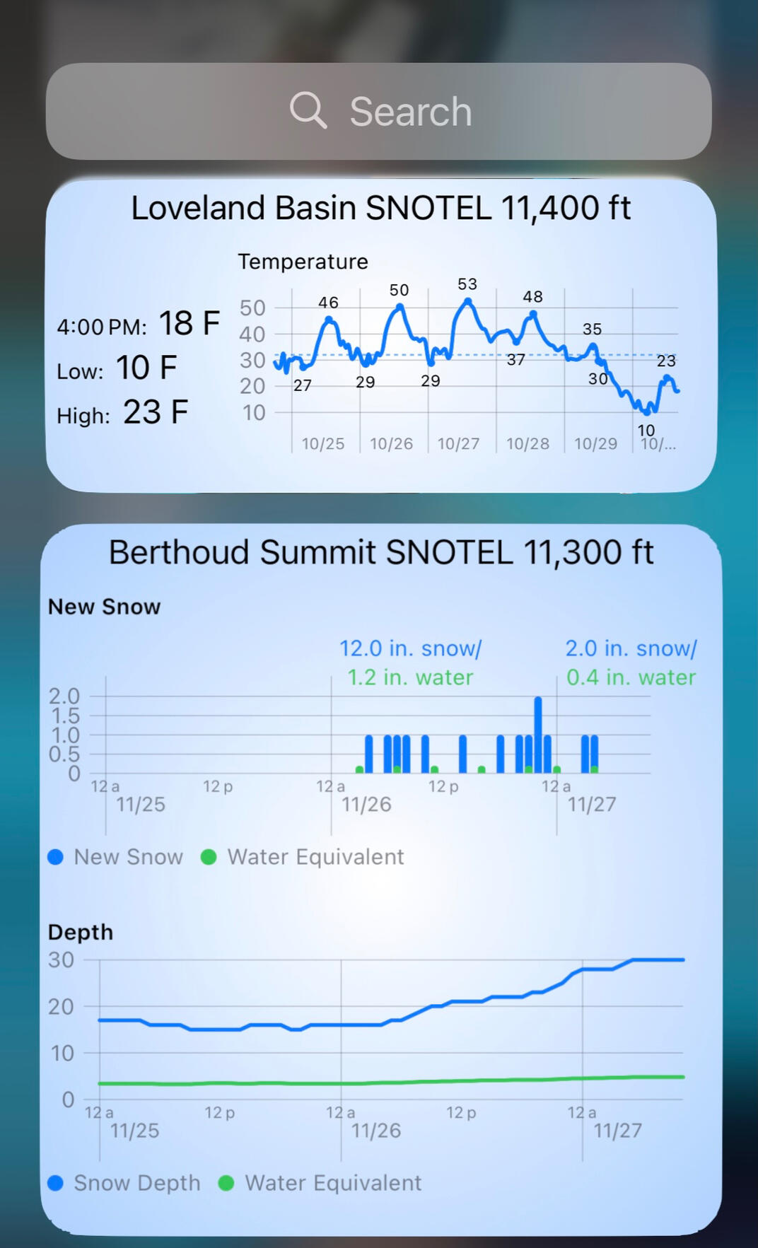 Home Screen widgets display real-time temperature and snowfall data from backcountry SNOTEL weather stations